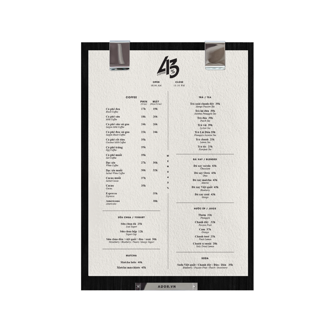 Menu 43% đã giải quyết vấn đề này một cách hiệu quả. Thay vì có hàng chục món, menu được chia thành các nhóm rõ ràng: Coffee, Trà/Tea, Đá Xay/Blended, Sữa Chua/Yogurt, Matcha, Nước Ép/Juice và Soda. Mỗi nhóm chỉ tập trung vào một số món cốt lõi, giúp nhân viên pha chế dễ dàng kiểm soát chất lượng và đảm bảo sự đồng đều trong từng ly đồ uống. Khách hàng khi nhìn vào cũng không cảm thấy “choáng ngợp” mà có thể nhanh chóng tìm thấy món mình muốn, từ đó đưa ra quyết định nhanh hơn.
