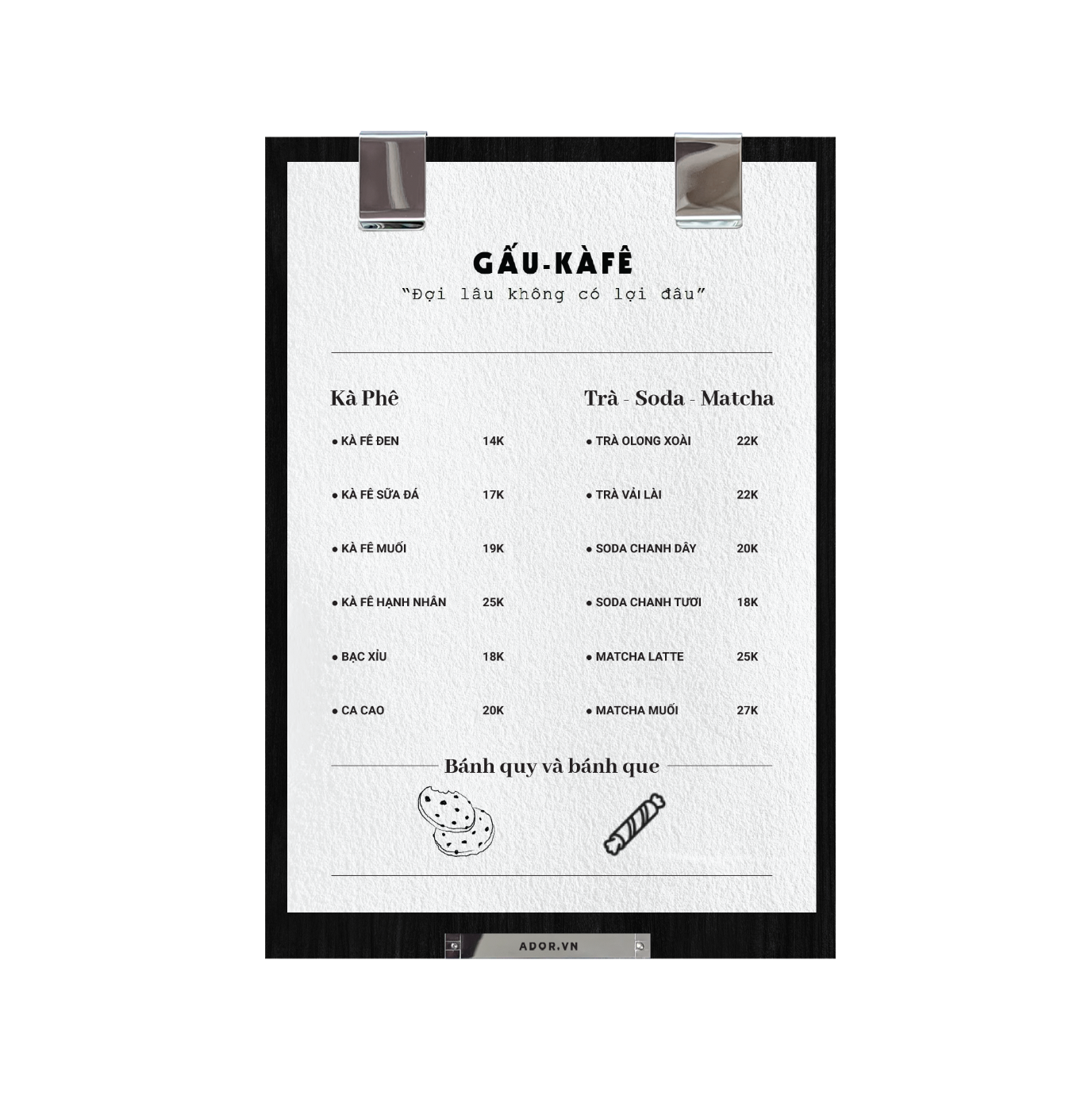 Menu Gấu Kà-Fê ở đây không dài dòng, chỉ khoảng hơn chục món thôi nhưng mỗi món đều có cái riêng, vừa dễ lựa chọn lại vừa đặc biệt. Cà phê đen, cà phê sữa đá hay cà phê muối, mỗi món đều có mức giá rất hợp lý, dao động từ 14K đến 25K, phù hợp túi tiền của mọi người. Mà điều ấn tượng nhất là, dù đơn giản nhưng lại rất tinh tế. Bán trà Olong xoài hay soda chanh dây, mỗi món nhìn thôi là đã muốn thử ngay!